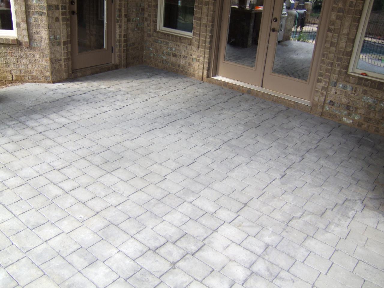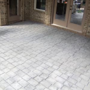 We used a tinted sealer to mottle on three different colors: a dark gray, a light gray, and then topped it with black. It made it look very aged. This is a fan cobblestone pattern engraved into the concrete.