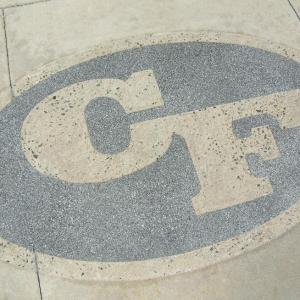 Three different acrylic stains were used to achieve the speckled look. Then the "CF" and outer ring were cut out to leave pretty neat looking logo in the concrete sidewalk. There are a total of three logos around the campus.