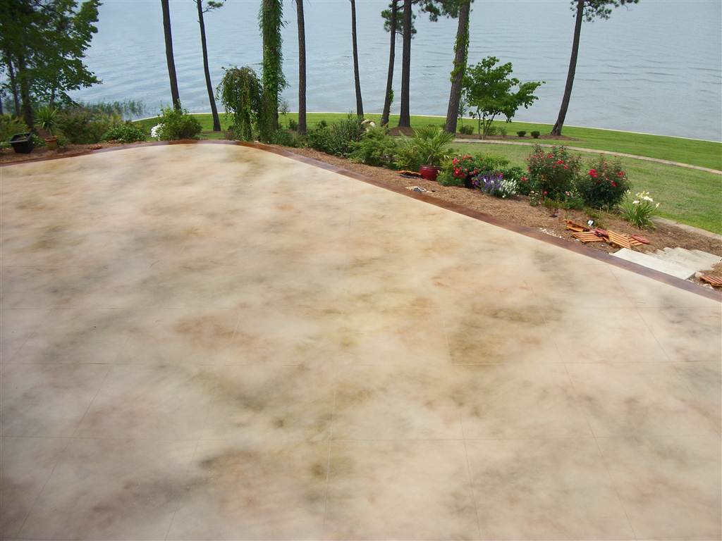 This home on Lake Tobesofkee did away with their pool and created a large back patio overlooking the lake. We used Smith's Desert Sand as a base and highlighted with Nutmeg and Bark Brown. The border is 12 inches wide and stained with Bark Brown.