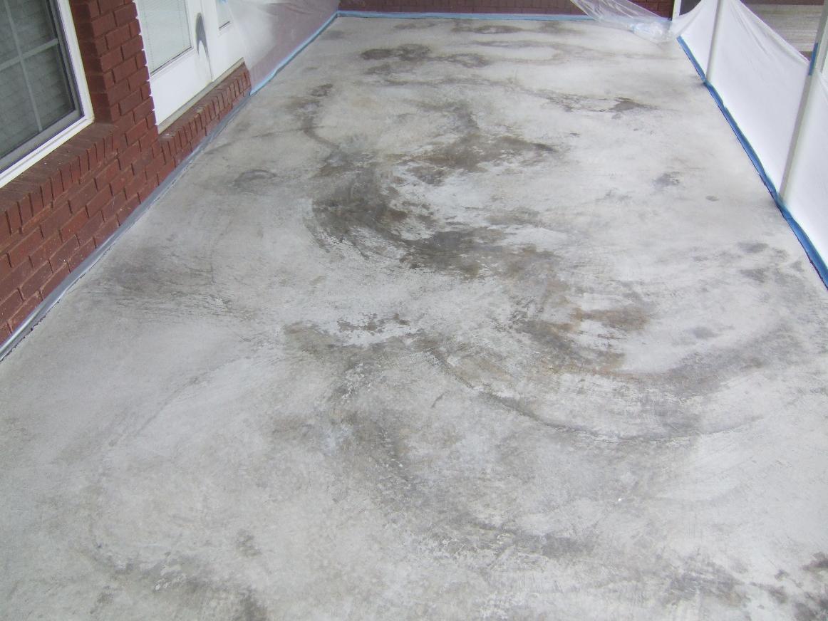 This concrete first got acid stained with Kemiko's Black. But there were some spots that wouldn't take the stain. This is a problem that happens rarely, but it does happen. We ended up overspraying the whole porch with a CR WRC blend of Mocha and Onyx.